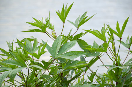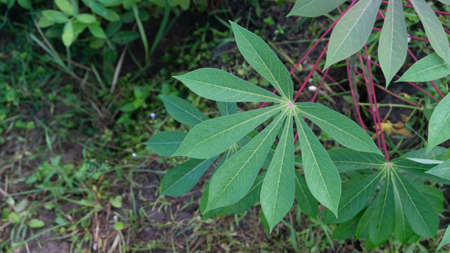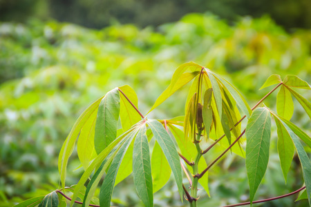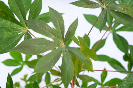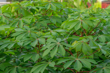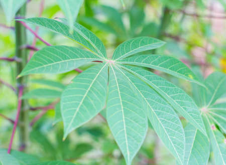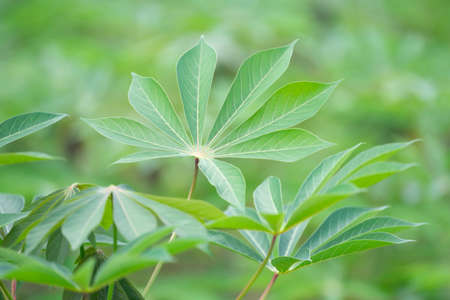 Green cassava leaves (Manihot esculenta), commonly called cassava manioc, or yuca, in shallow focus. It can be used for vegetables.