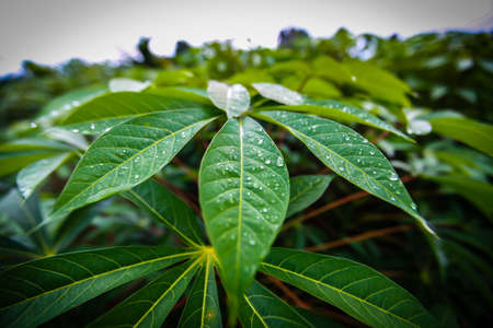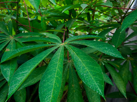 Green leaves of Cassava and droplets on leaves in rainy day, Thailand.