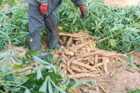 Mahasarakham,Thailand-May 1,2020:Farmer harvest cassava in farmland before rainy season.