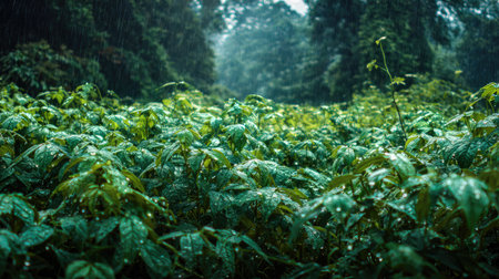 A panoramic wide view of Kenaf field growing closely together under light drizzle soft raindrops on leaves ultra realistic photography natural daylight cinematic wide composition lifelike natural scene