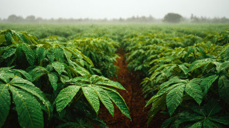 A panoramic wide view of cassava field growing closely together under light drizzle soft raindrops on leaves ultra realistic photography natural daylight cinematic wide composition lifelike natural scene