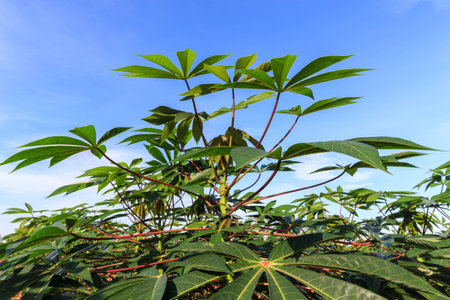 Cassava plant from below with green leaves and thin red stems against blue sky. Tropical agricultural crop, fresh foliage in sunlight, natural organic farming, low angle view.
