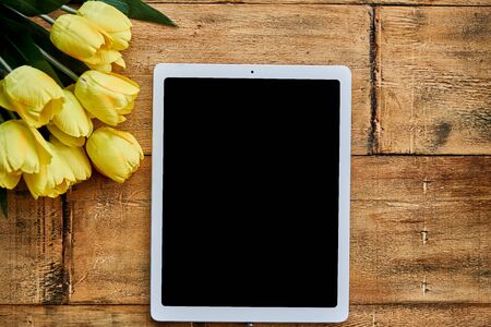 Computer tablet with black empty screen next to coffee. The tablet is on the white table. View from the top. Close-up.