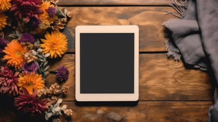 Tablet mockup place on the wooden table with flower autumn leaves background, warm tone color, generative ai