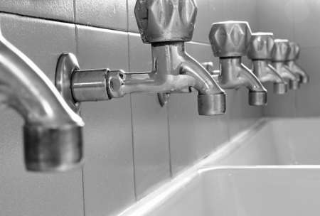 Old faucet in row,old valve faucet with dirty blass faucet in old tub on school children