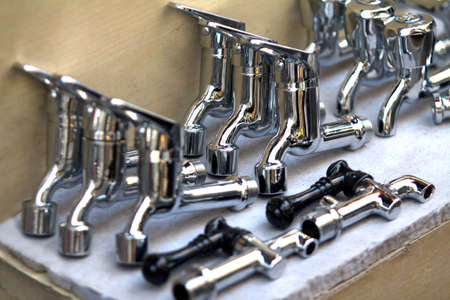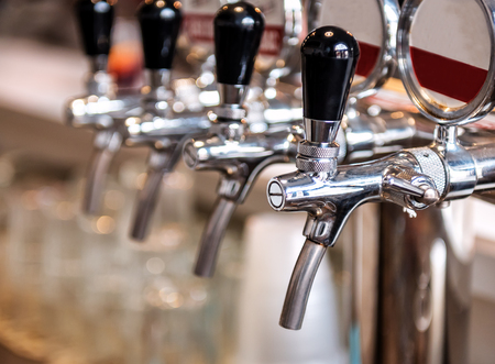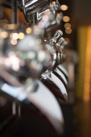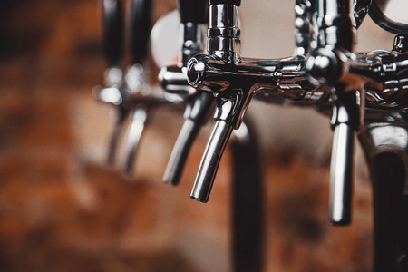 Number of chrome-plated faucets for pouring beer in bar, pub.