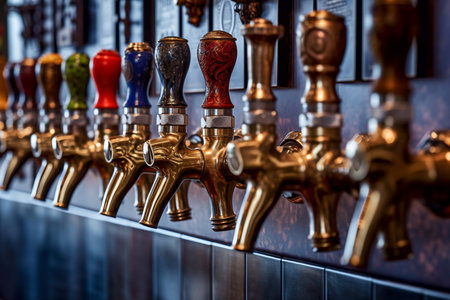 A row of colorful beer taps on a bar counter. The taps are of different colors and sizes, and they are arranged in a neat row. The scene suggests a lively atmosphere