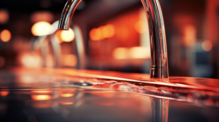Modern chrome faucet close up over white ceramic sink in bathroom with warm light and blurred background