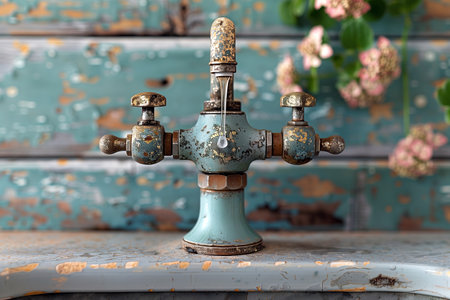 Generative AI Vintage-style bronze kitchen faucet, rustic charm, detailed knobs, atmospheric water droplets, intricate linework