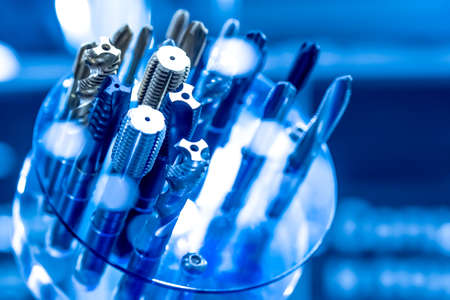 The groups of CNC machine tapping tool in the blue tone scene. The various type of tapping tool.