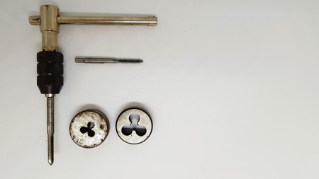 Old used kit for cutting an external thread, close up, top view, stylized, Threading dies
