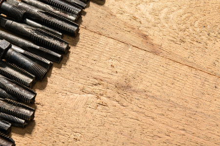 Metalwork tools on the workshop table. Threading dies and taps in an old dusty workshop. Black background.