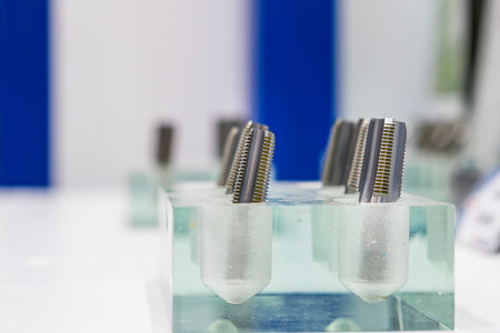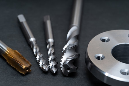Set of thread taps, industrial metalworking tools, close-up shot, shallow depth of field