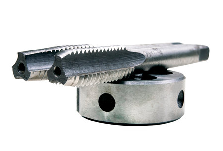 Old used kit for cutting an external thread isolated on white background. tap and dies spiral flute. Cutting tool make thread for right screws.