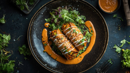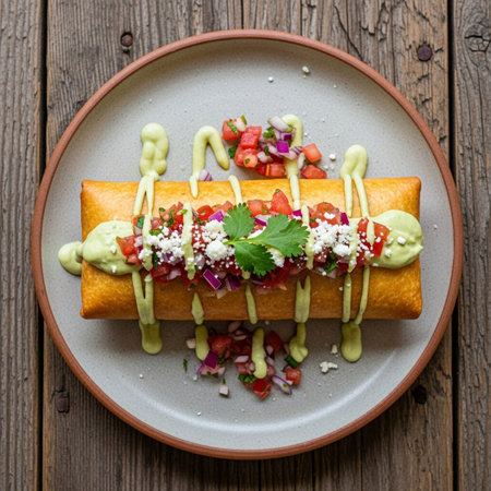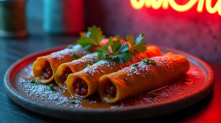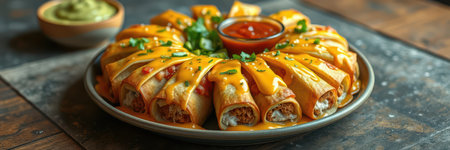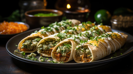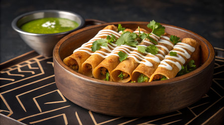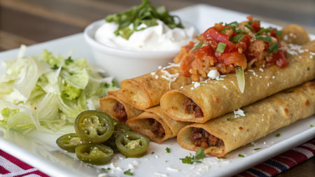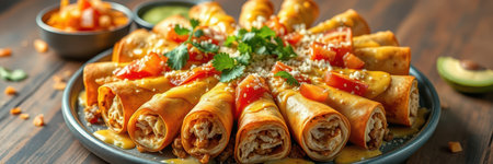 Delicious platter of rolled tacos garnished with fresh ingredients served on a rustic wooden table