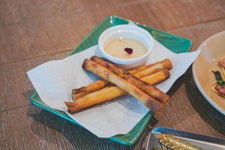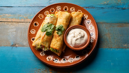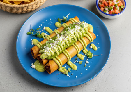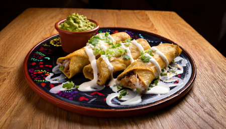 chicken flautas accompanied by cheese cream and guacamole presented at a traditional mexican restaurant