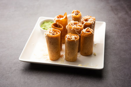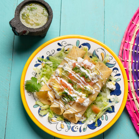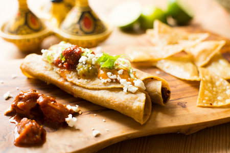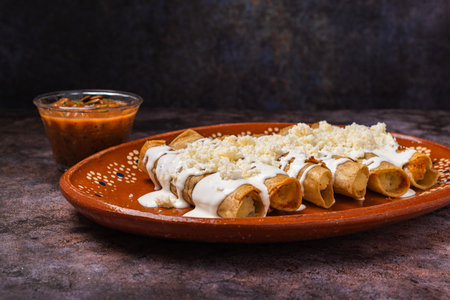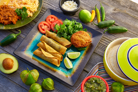 Mexican flautas rolled tacos with salsa and Mexico food ingredients