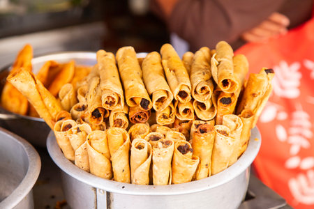Deep fried spring rolls, Chinese cuisine staple, at a street food market.