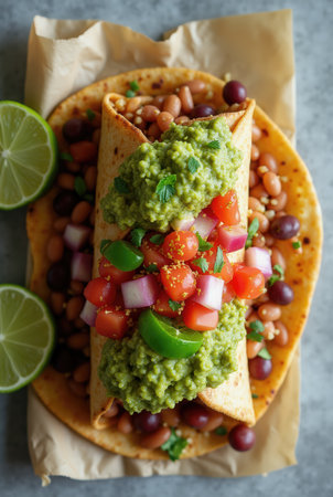 This colorful burrito bowl features tortillas filled with beans, topped with guacamole, diced tomatoes, and onions, accompanied by lime wedges for added flavor.