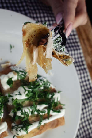 Pancakes stuffed with minced meat and vegetables served with sour cream