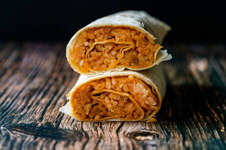 Healthy Vegan / Vegetarian Tortilla Wrap with Rice Pilaf on Wooden Surface. Organic Food.