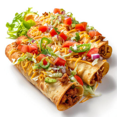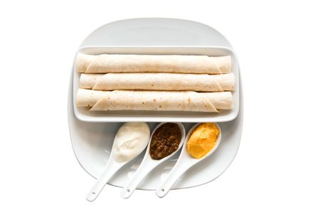 Traditional mexican fried tacos also called flautas on white background