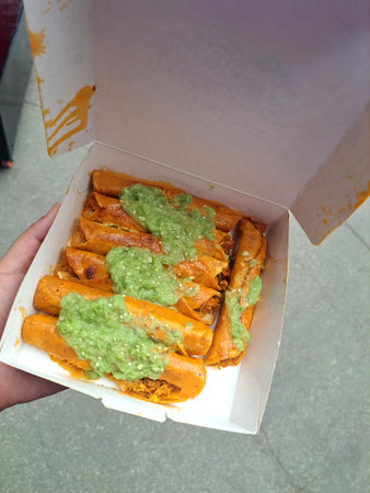 Flautillas is a dish of Mexican gastronomy, known as `Mexican snacks`, are tacos made of rolled dough tortilla which can have different content.