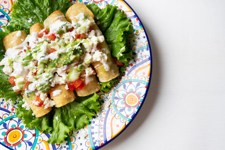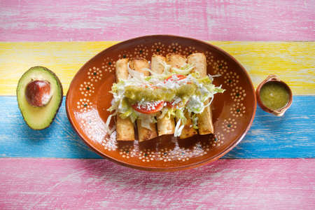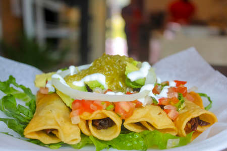 Traditional Mexican food, golden meat tacos (flautas) with guacamole, lettuce, tomato and avocado.