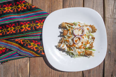 Traditional mexican fried tacos also called flautas on wooden background