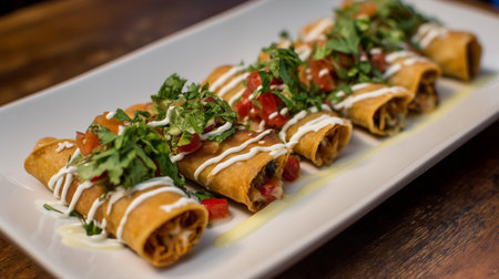 Upscale culinary presentation of crispy golden flautas on a white platter, decorated with zig-zag crema lines, fresh diced tomatoes, and chopped cilantro. Fine dining style.