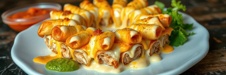 Mexican chicken and cheese rolled taco taquitos smothered in hot sauces and creme fraiche