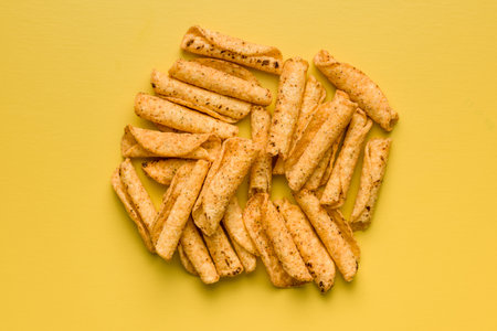 Rolled nachos tortilla chips on an yellow background. Top view.