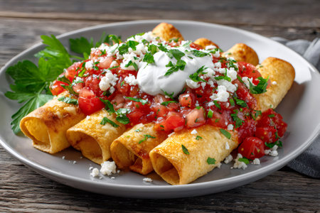 Delicious taquitos covered with pico de gallo, sour cream, crumbled cheese, and fresh parsley on a gray plate
