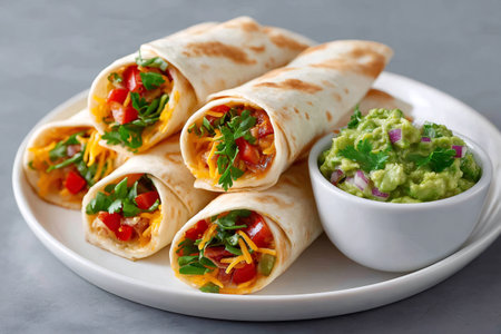 Mexican burritos filled with cheese, tomatoes, and cilantro served with a side of fresh guacamole