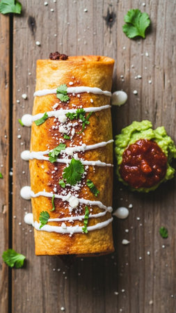 Tasty Mexican burrito with guacamole, sour cream, and fresh cilantro on a wooden background, perfect for food and restaurant concepts.