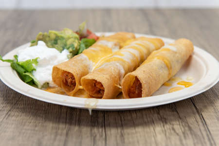 Three crispy deep fried chicken taquitos covered with melted cheese and served with a scoop of sour cream, guacamole, and pico de gallo.