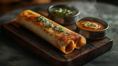 A beautifully presented Indian dosa, golden and crispy, served with vibrant chutneys on a wooden platter, ideal for showcasing culinary delights.
