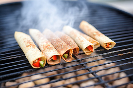 flautas on a grill mesh with char marks
