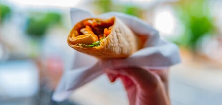 Chicken breast with piri piri sauce and lettuce in a chili tortilla wrap in the hand, tasty food