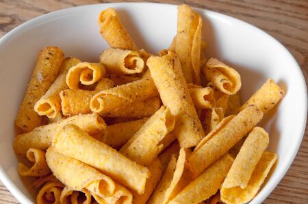 cheese potato chips in white bowl on wooden table