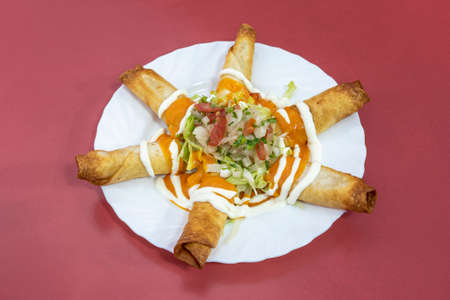 Plate of fried Mexican flautas with pico de gallo, vegetables, pumpkin cream and cream cheese on white plate