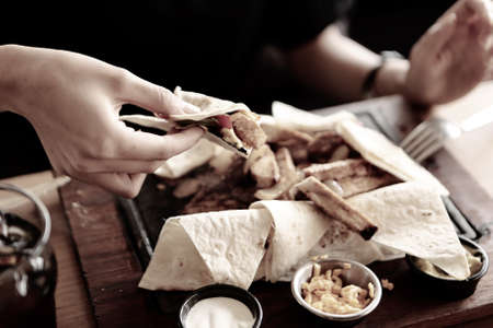 A vertical shot of a male hand holding meat and vegetable wrap on background of food