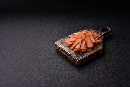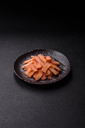 Pickled sushi ginger slices in black plate on stone background, close up, macro.