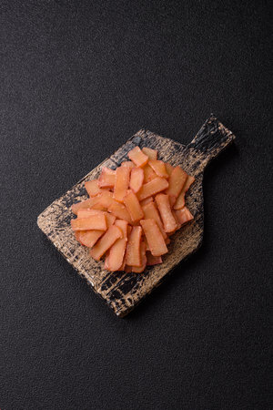 Food, dried squid in shavings or chopped as snacks or jerky. Snack dried squid for beer, background for your design