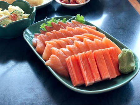 Crab stick and salmon sashimi set. Japanese food style