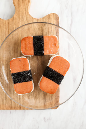 Top View Spam Mushubi Beef Corned with Rice and Nori Belt