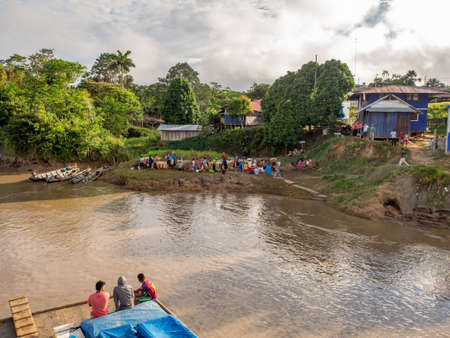 Amazon River, Peru - May 12, 2016: Small village on the bank of the Amazon River. Amazonia, South America.