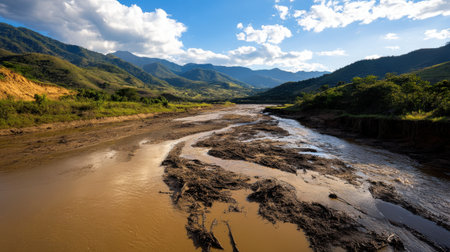 A river flowing through deforested valley with muddy water