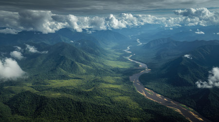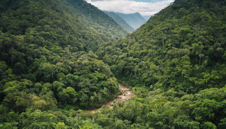 A river gracefully curves through a vibrant rainforest filled with greenery, surrounded by mountains, and a cloud-covered sky adding to the tranquil atmosphere.