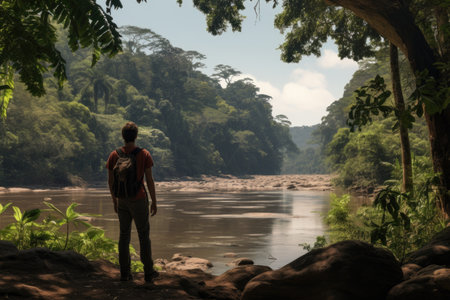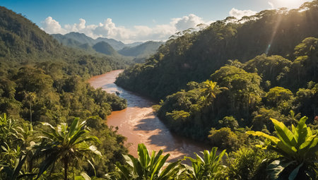 A meandering river cuts through the dense and verdant foliage of a vibrant jungle in a remote location, A river trailing through rainforest terrain at dawn, AI Generated